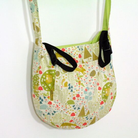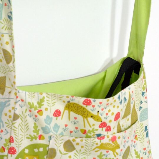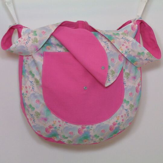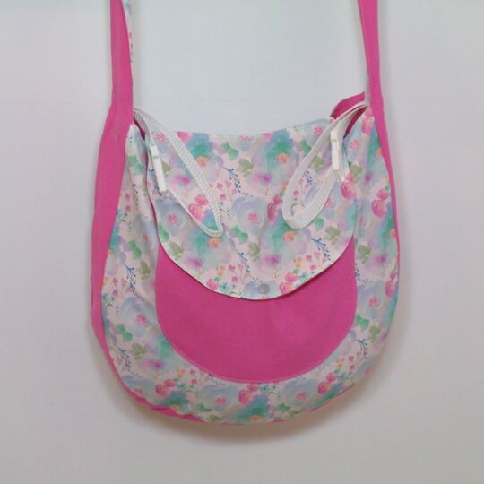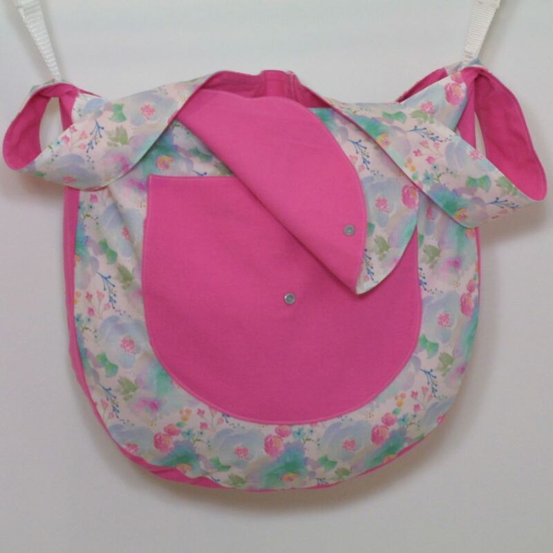 Die Tasche ist doppelt gearbeitet mit einer Außen- und Innentasche. Sie hat eine breite Trageschlaufe. Die Seitenteile gehen in die Schlaufe über.
