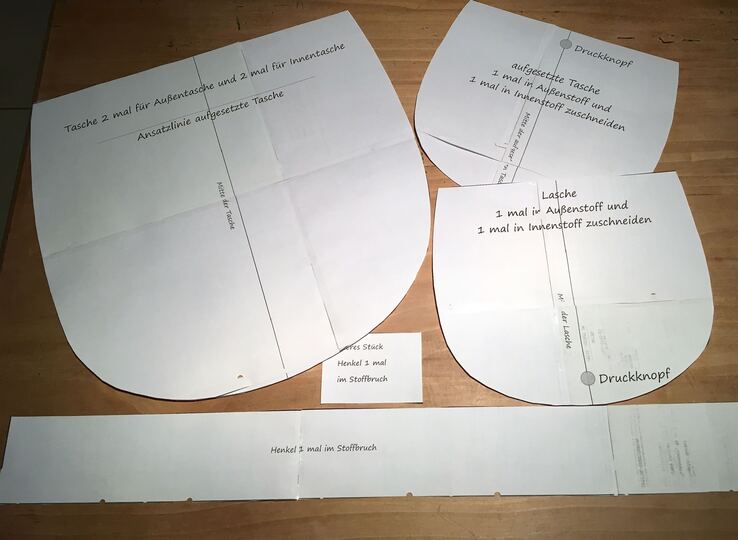 Man benötigt 60 cm eines 150 cm breiten Stoffs für die Außentasche, dasselbe noch einmal für die Innentasche, zwei einschlagbare Druckknöpfe, 1 m Gurtband und zwei zugehörige Steckschließen.