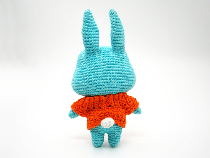Mit 2.0 mm Nadel und Sport Garn wie z.B. Puppets Lyric 8/4 oder Catania Originals wird das Häschen ca. 16 cm groß & 8 cm breit.