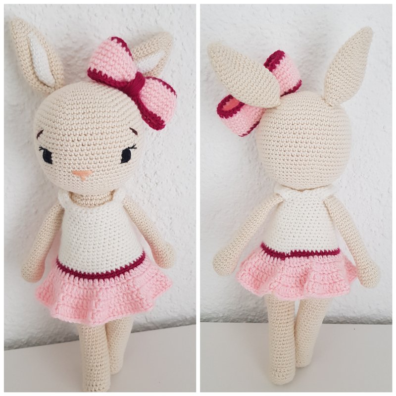 Der Hase ist ca. 35cm groß. Die Größe ist jedoch auch abhängig davon, wie fest oder locker gehäkelt wird. Bei der Verwendung anderer Wolle muss die Nadelstärke und auch die Wollmenge entsprechend angepasst werden.