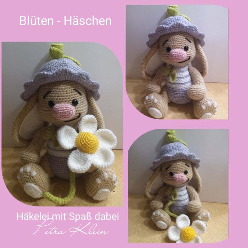 Ich habe das Blüten-Häschen mit einer Häkelnadel der Stärke 2,0 und dazu passender Wolle gearbeitet und es hat bei mir eine Größe von ca. 24 cm.