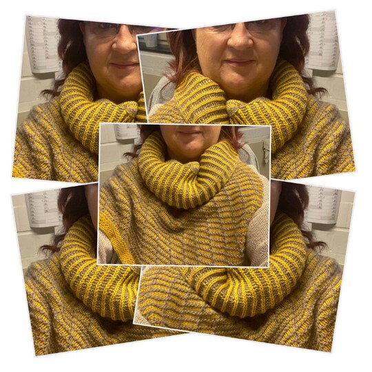 Es wird oben in Runden ein 2farbiges einfaches Patent gestrickt, der als Rollkragen getragen wird.