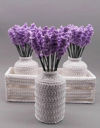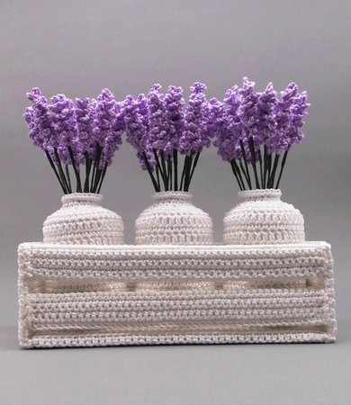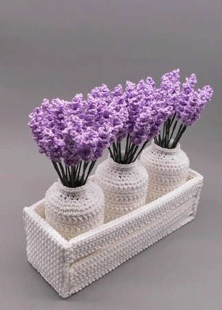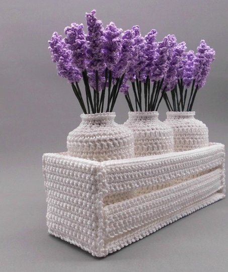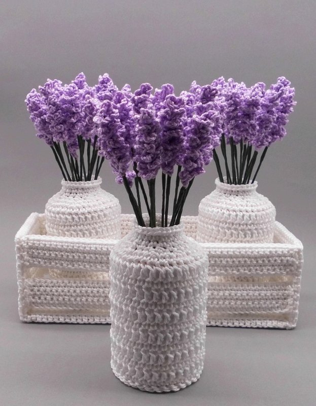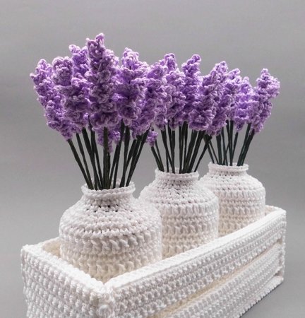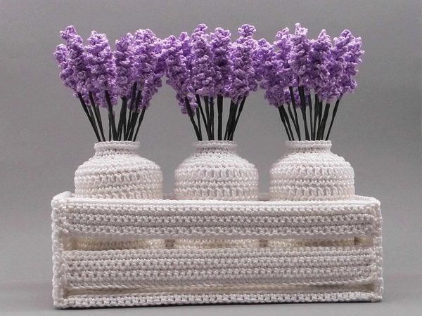 Die Lavendel-Stiele, die Vasen und das Deko-Tablett lassen sich, auch von Anfängern, sehr einfach nachhäkeln (nur Luftmaschen, Kettmaschen, feste Maschen und Stäbchen) und sehr vielseitig zur Dekoration nutzen.