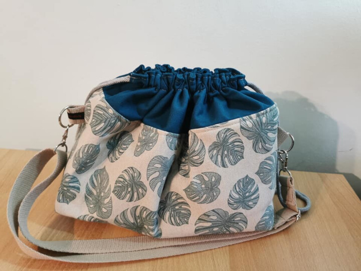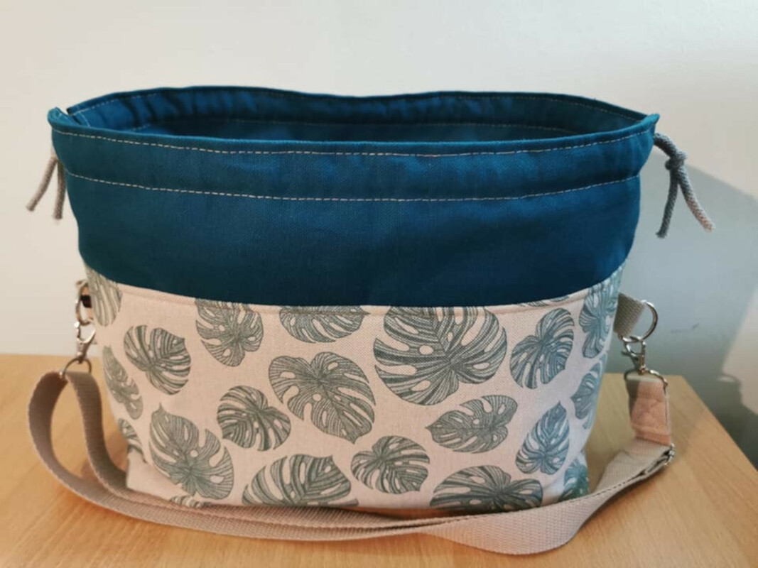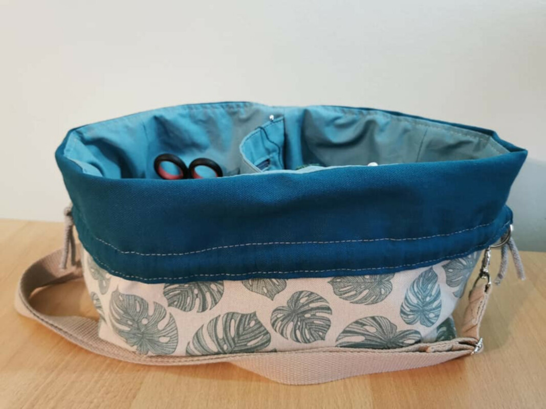 Geschlossen wird die Tasche mit einem Tunnelzug. Durch den in der Länge verstellbaren Träger kann man die Tasche super mit zum Handarbeitstreffen mitnehmen.
