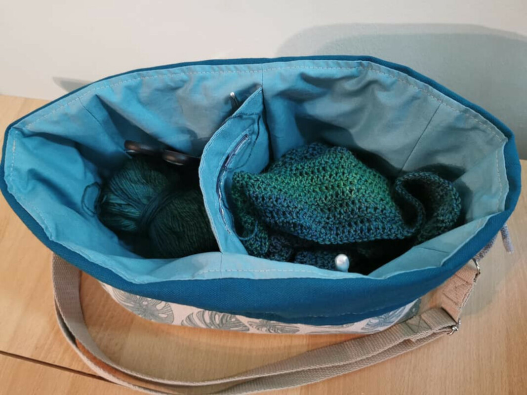 Man kann sein derzeitiges Projekt mitnehmen. Das Garn und das Werkstück kann man in die verschiedenen Bereiche legen.