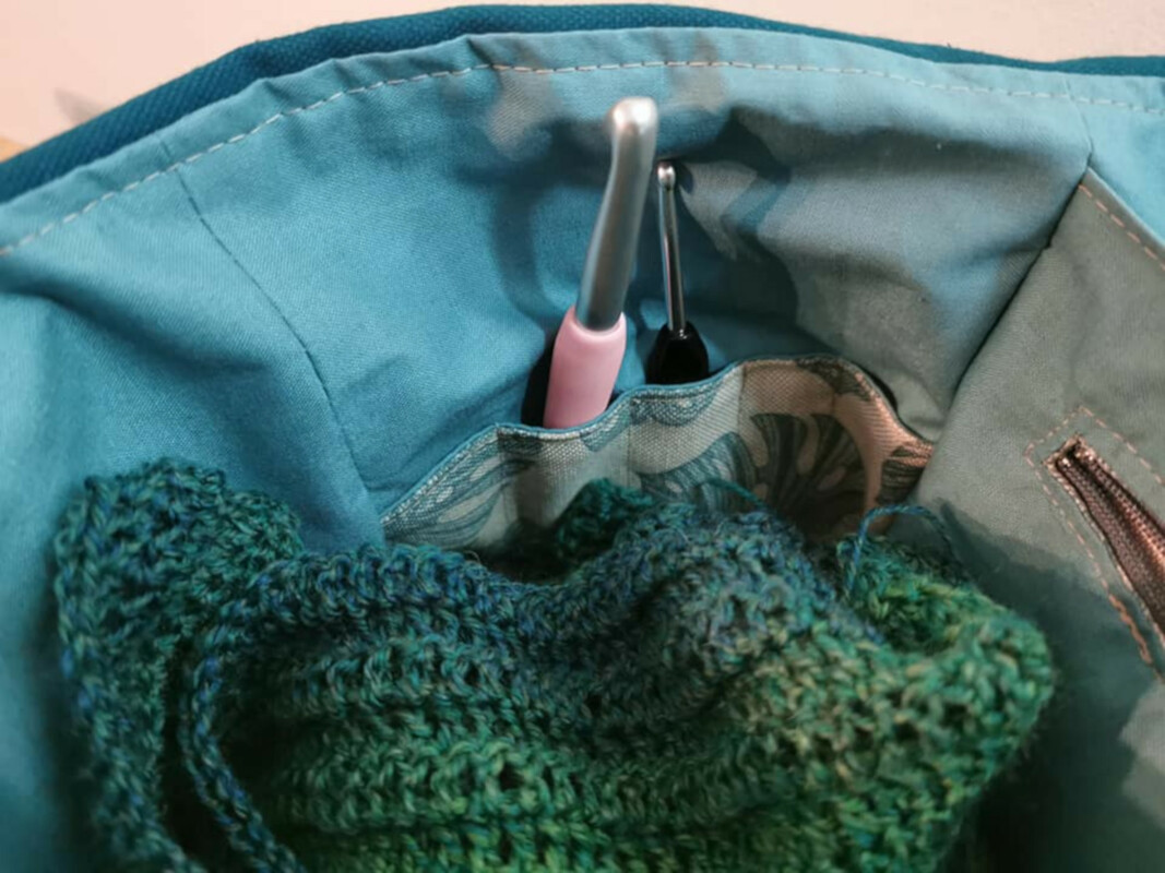 Die Steckfächer sorgen für eine tolle Unterbringung von den Strick- oder Häkelnadel und der Schere. In dem Reißverschlussfach kann man super die Maschenmarkierer unterbringen.