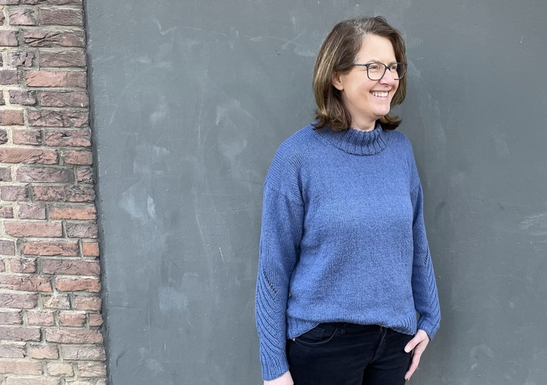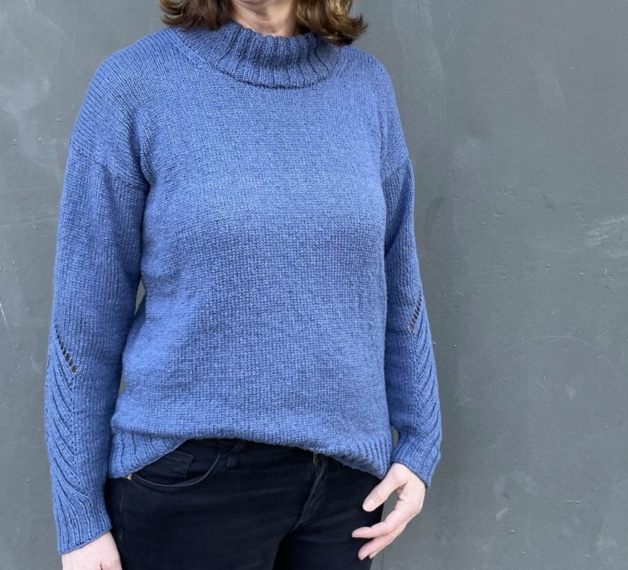 An den Bündchen vom Rumpf und an den Ärmeln wird ein doppeltes Rippenmuster gestrickt. Am Ärmel wird das Bündchenmuster in der Mitte quer weiter fortgeführt und schließt mit einem Lochmuster ab. Auch wenn sich die Bündchen beim Stricken etwas zusammen ziehen, öffnen sie sich durch die Wäsche und beim Tragen. Der Pullover muss später zusammengenäht werden und wird von unten nach oben gestrickt.