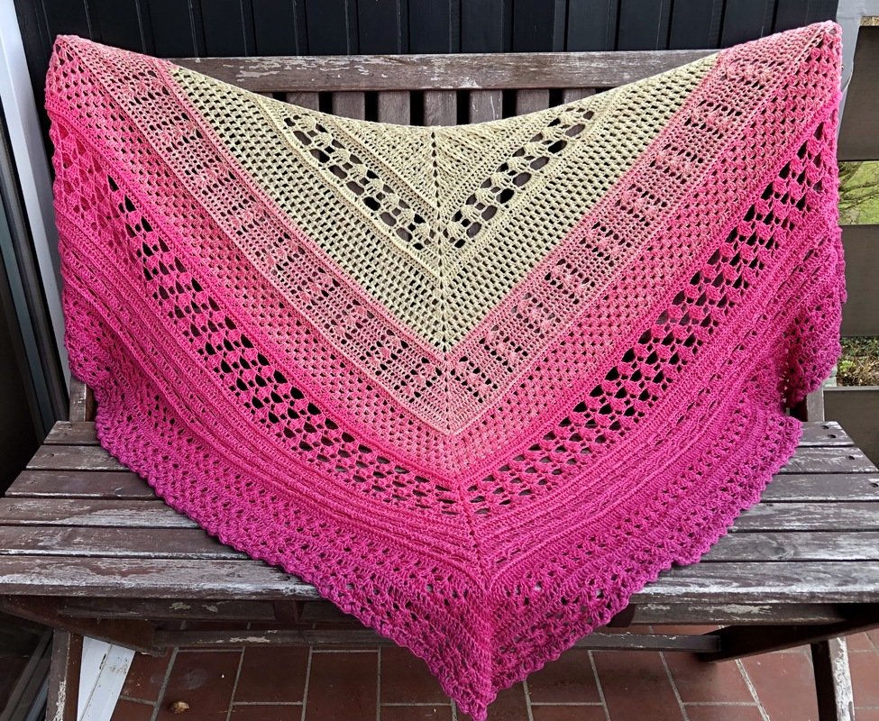 Die Anleitung besteht aus 16 Seiten auf denen Schritt für Schritt erklärt wird, wie das Tuch nachgearbeitet wird. Neben einem ausführlichen Textteil, gibt es zu jedem Muster auch eine Häkelschrift.