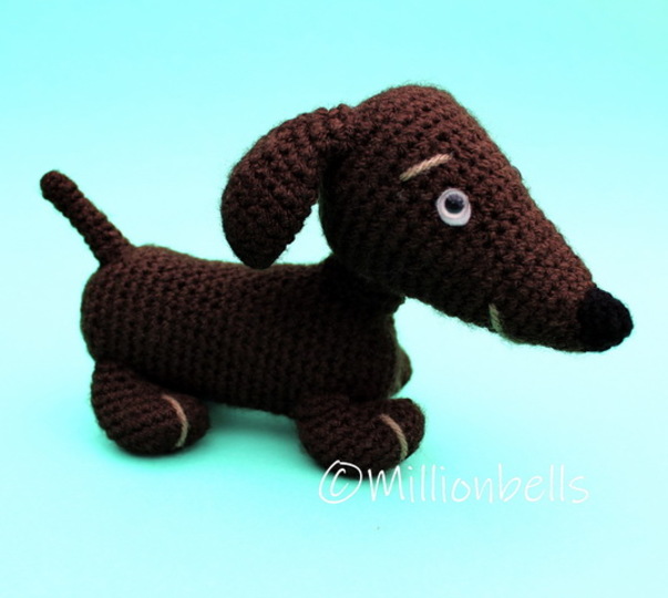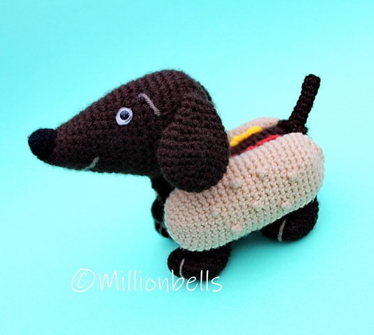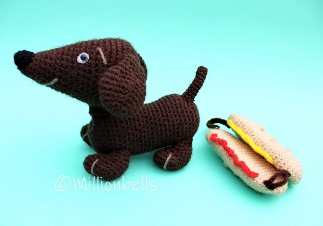 Diese Anleitung führt Sie zum Häkeln eines niedlichen kleinen Dachshund mit Hot Dog Brötchen, wie in den Bildern gezeigt. Das Brötchen wird mit gehäkelten Gürteln und einem Druckknopf am Hund befestigt, damit es auf Wunsch vom Hund entfernt werden kann.