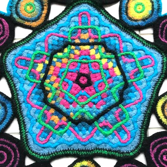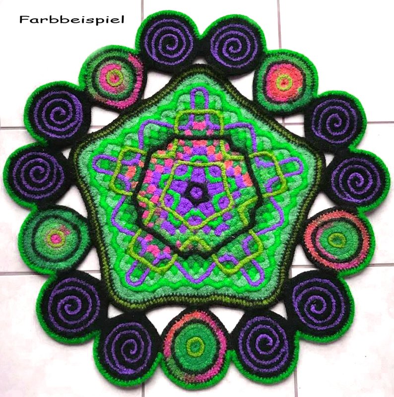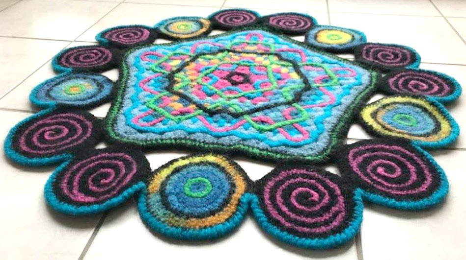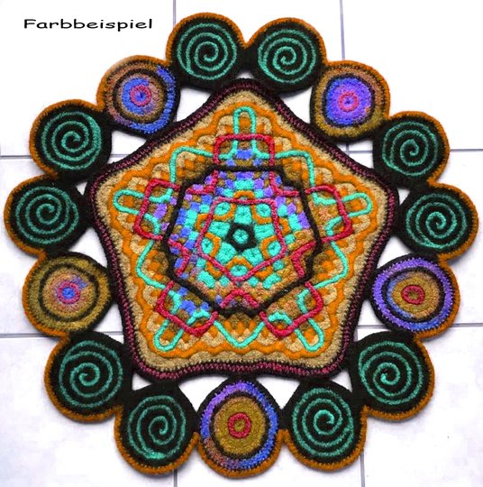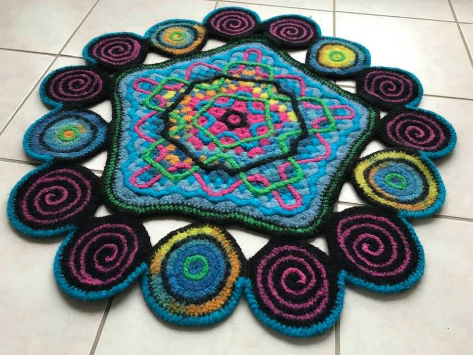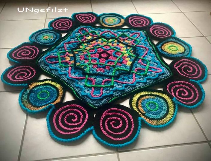 Den pfiffige Teppich "Circle of Harmony" habe ich aus ca. 780 gr Filzwolle gehäkelt