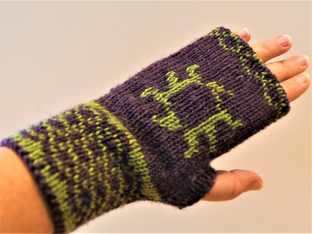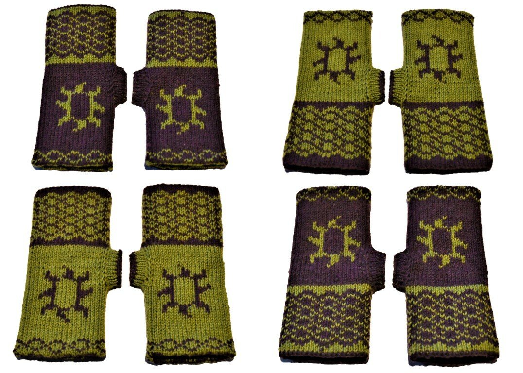Diese Armstulpen „Varia“ haben nur Schokoladenseiten 😊 Du kannst die Blume auf dem Handrücken tragen, und die Sonne an der Handfläche, oder die Blume unten und die Sonne oben. Heute lieber mehr Aubergine als Grün? Dann wende sie auf die andere Vorderseite. Oder Du drehst sie und trägst das Muster an den Fingern und die Motive am Armgelenk. Alles ist möglich, und alles sieht hübsch aus. Mit diesem einen Paar hast Du insgesamt acht Tragevarianten.