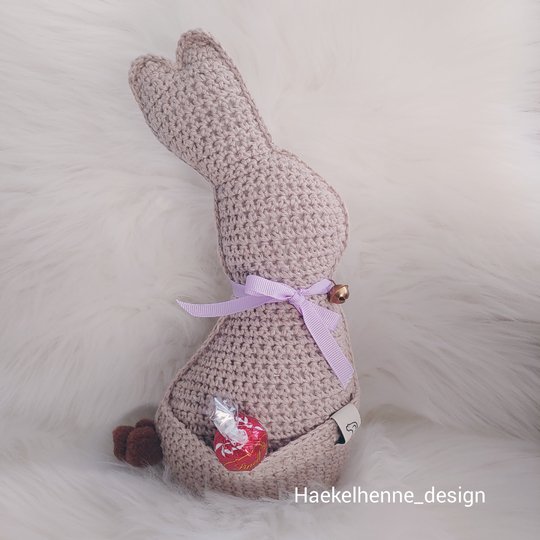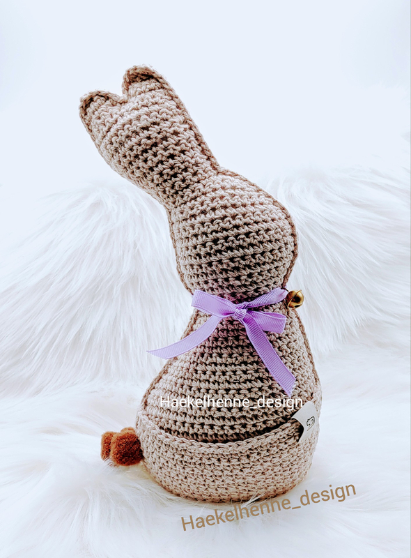 Die Hasendame wird in Schulgarn mit der Nadelstärke 3,0 ca. 28-29 cm hoch im gefüllten Zustand.