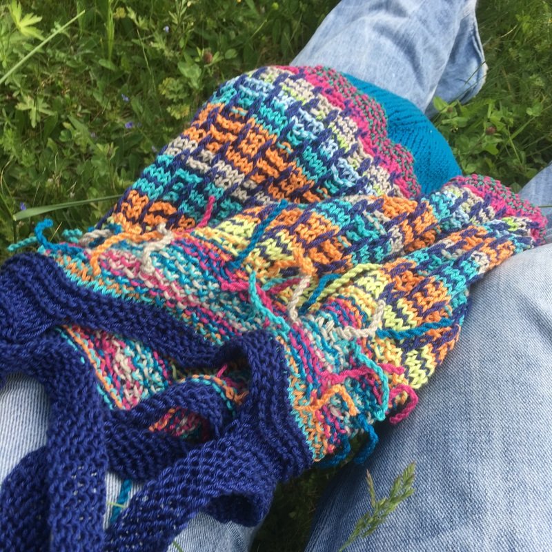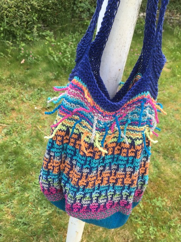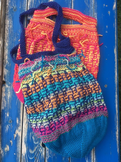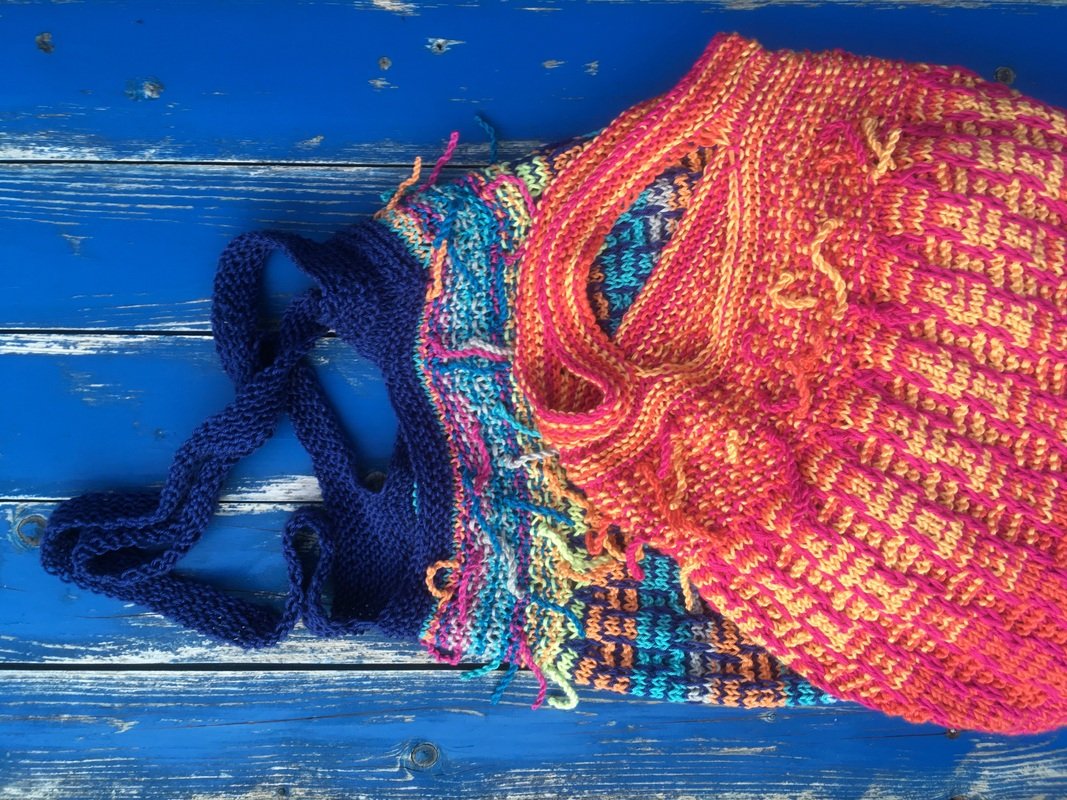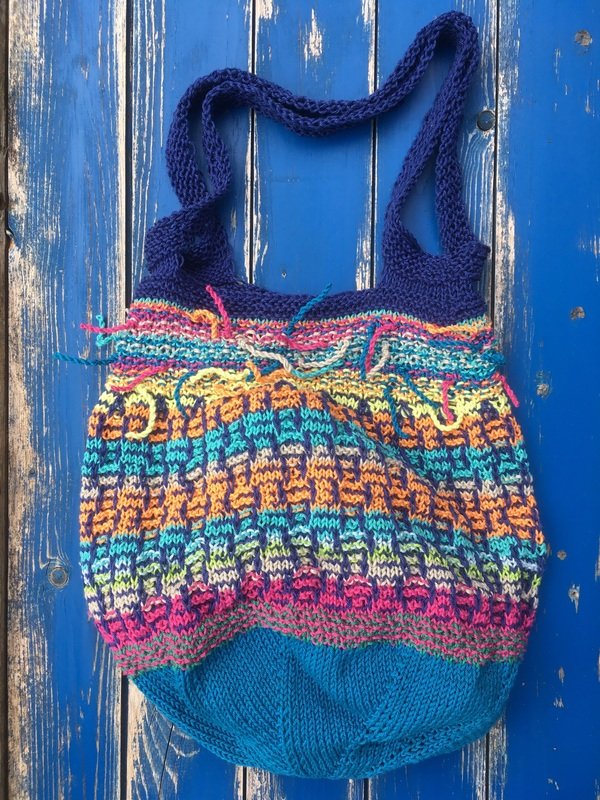 Die abgebildete Variante 2 ist aus Bahia von „Schoeller und Stahl“ (50% Viskose/50% Polyacryl; 106m/50g) gestrickt und hat einen kurzen Griff.
