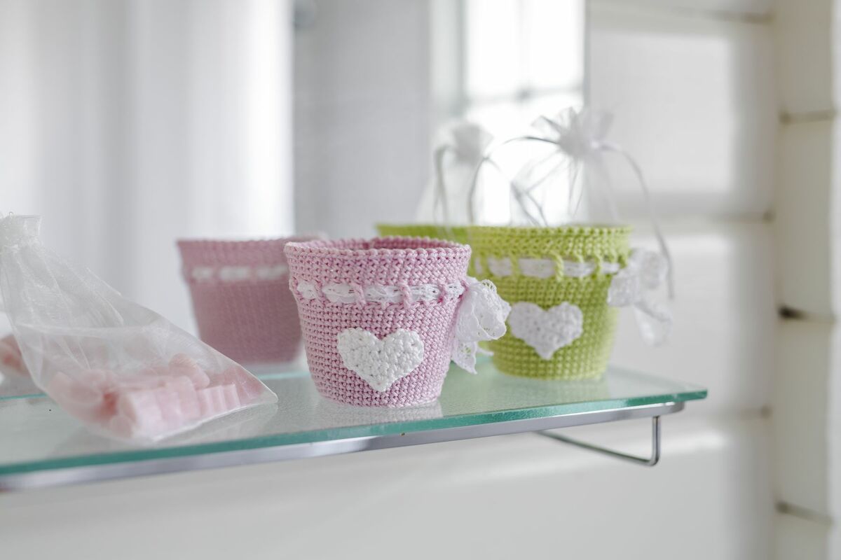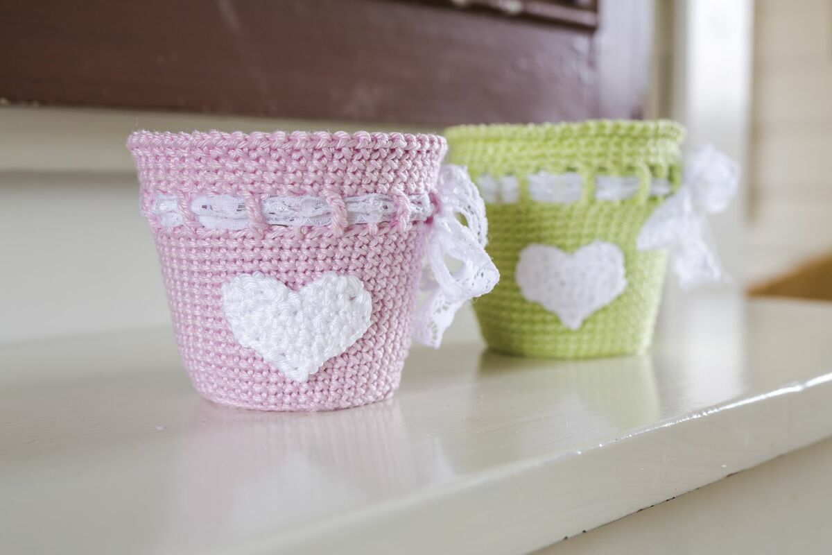 Häkelanleitung für eine zuckersüße kleine Gläserhülle, gehäkelt aus festen Maschen und Doppelstäbchen.