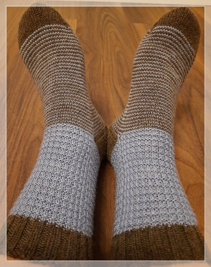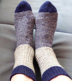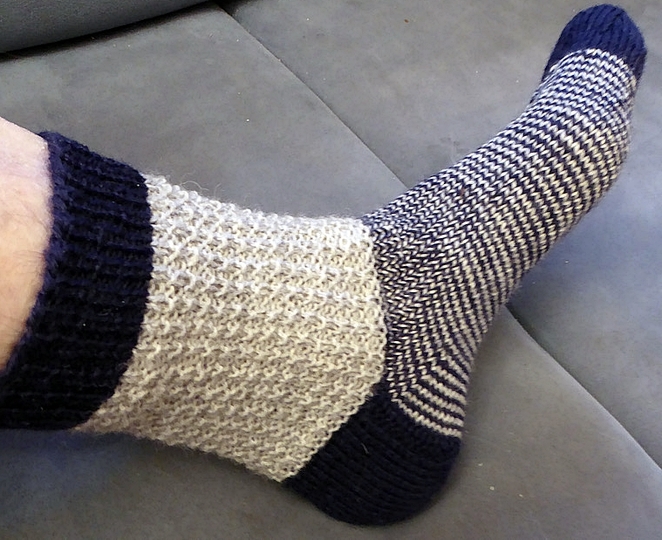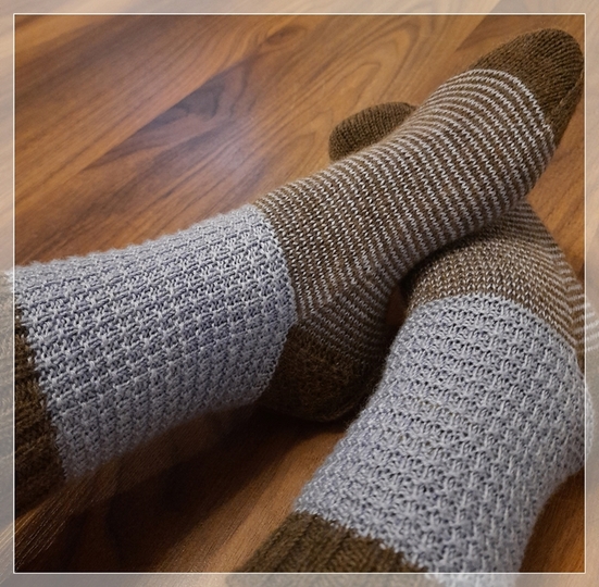 Das Strukturmuster - welches über den Schaft gestrickt wird - besteht nur aus rechten und linken Maschen. Über den Fuß wird ein einfaches Ringelmuster gestrickt.