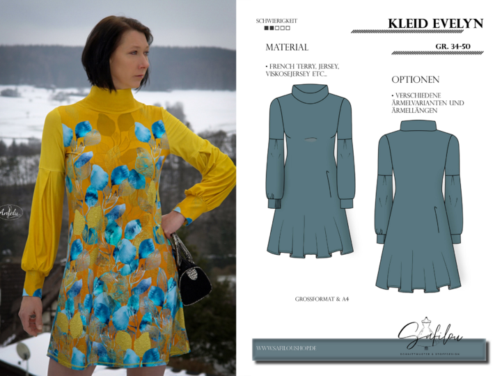 Das Kleid Evelyn ist ein elegantes und vielseitiges Schnittmuster, das mit seiner femininen Silhouette und stilvollen Details überzeugt. Ob für den Alltag, das Büro oder festliche Anlässe – dieses Kleid passt sich jeder Gelegenheit an und lässt sich individuell gestalten.