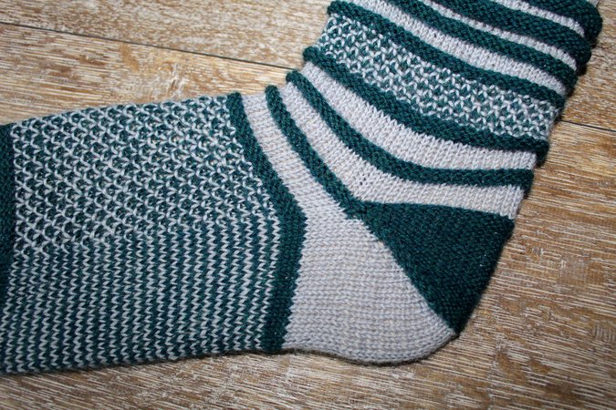Anleitung für ein Sockenmuster, das in 2 Unifarben gestrickt wird. Es besticht durch den häufigen Farb- und Musterwechsel. Außerdem durch das Tauschen der Farben bei der 2. Socke.