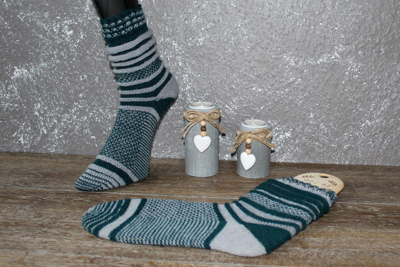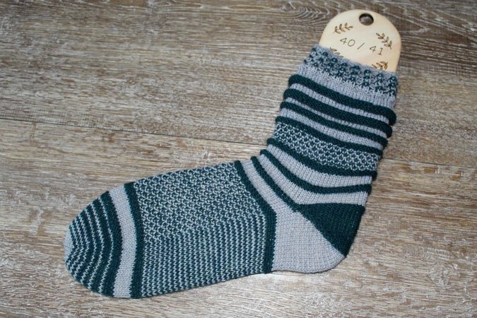 Die hier gezeigte Socke ist mit 64 Maschen für Größe 40/41 gestrickt. Sie kann aber auch mit jeder anderen Maschenzahl gestrickt werden. Die Fußlänge kann problemlos angepasst werden; ist in der Anleitung beschrieben.