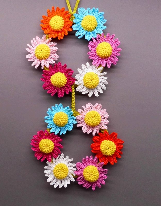 Ob fröhlich-bunt oder Ton-in-Ton, die Blumen-Kränze sind schnell gehäkelt und dadurch auch ein schönes Geschenk, zum Beispiel zum Valentinstag, zum Muttertag oder zum Geburtstag.