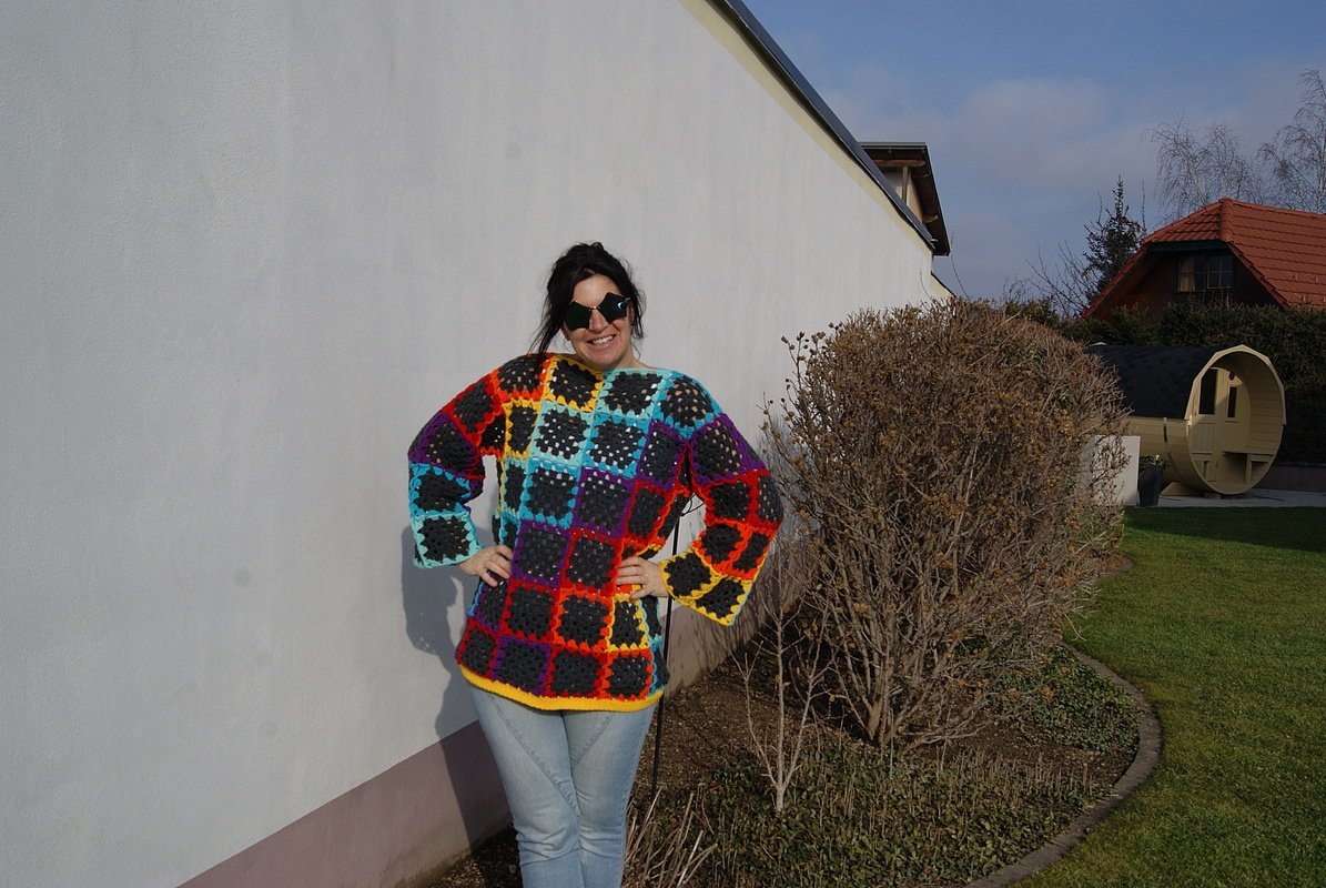 Ganz schön bunt – es sind natürlich auch ruhigere Farbkombis möglich. Cooler, lässiger und kuschelig bequemer Häkelpulli, der in angesagtem Oversize-Look mit einfachen Grannys perfekt zum Drüberziehen ist - egal ob über Top oder Langarmshirt!