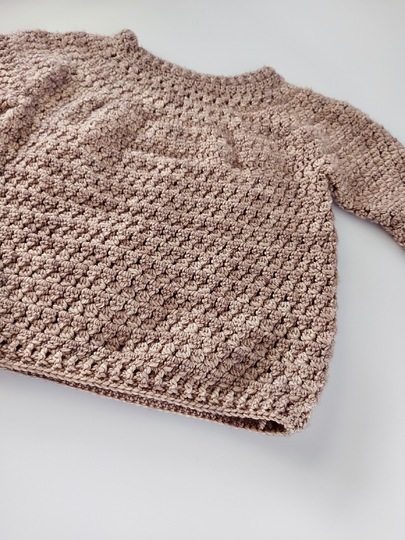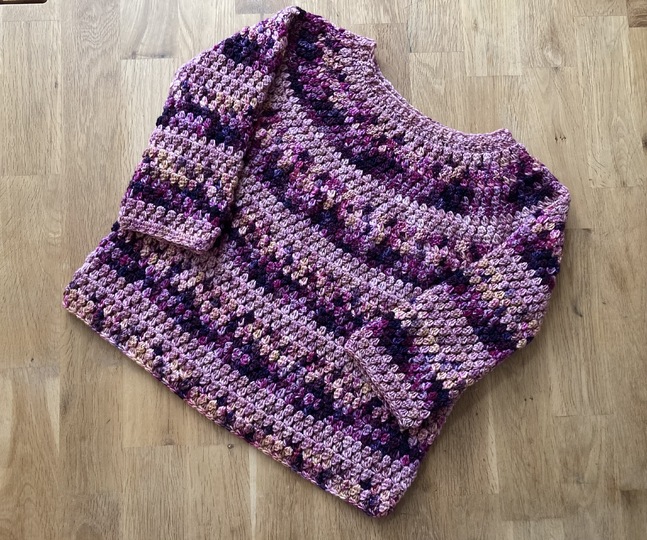 Die Ärmel werden direkt an den Pullover angehäkelt, so dass das Vernnähen von Einzelteilen nicht nötig ist.