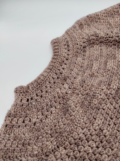 Er wird von oben nach unten als Rundpasse in einem Stück gehäkelt. Dadurch kann er einfach an jede beliebige Größe angepasst werden.