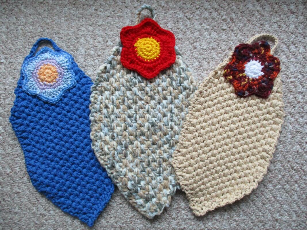Diese Topflappen haben eine Länge von 34cm, Breite 16cm, mit dem von mir verwendeten Baumwollgarn, welches ich doppelt verhäkelt habe. Für den roten und bunten Topflappen habe ich je 1 Restpäckchen verwendet mit etwas dickerem Garn, ist er etwa 1,5-2 cm größer geworden. Du kannst jedes Garn verwenden, beachte nur das der Topflappen eine griffige Stärke bekommt, und passe deine Häkelnadelstärke dem Garn an.
