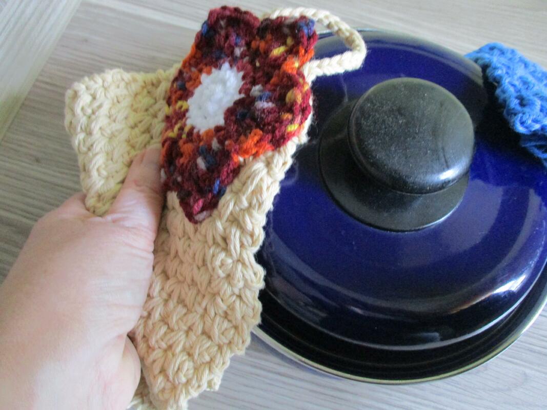 Dieser Topflappen bringt Farbe in deine Küche, ist ein toller Hingucker und auch ein schönes Geschenk oder Mitbringsel. Schnell und einfach mit festen Maschen gehäkelt, ist er auch gut für Anfänger geeignet. Ob einfarbig oder bunt, deiner Kreativität sind keine Grenzen gesetzt. Die Blüten sind bestens geeignet zur Reste –Verwertung.