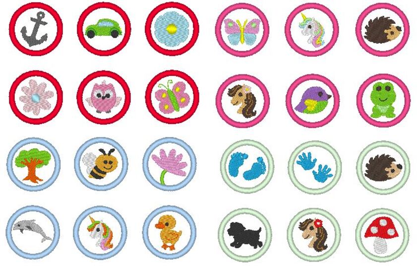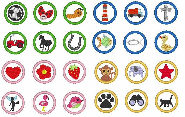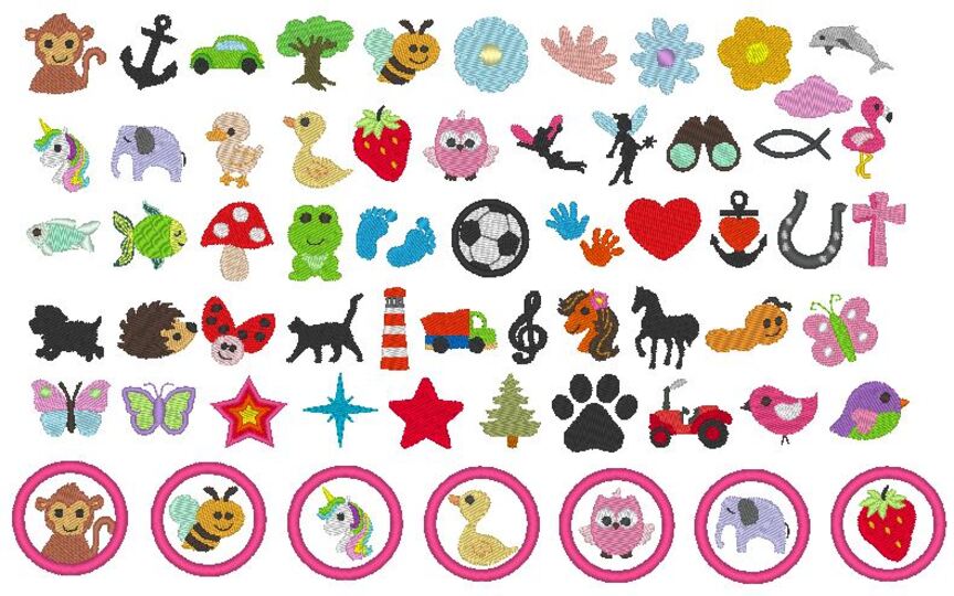 mit Einhorn, Blumen, LKW, Traktor, Fee, Baum, Ente, Anker, Stern, Frosch, Füßchen, Fußball, Erdbeere, Fliegenpilz und vielen mehr.