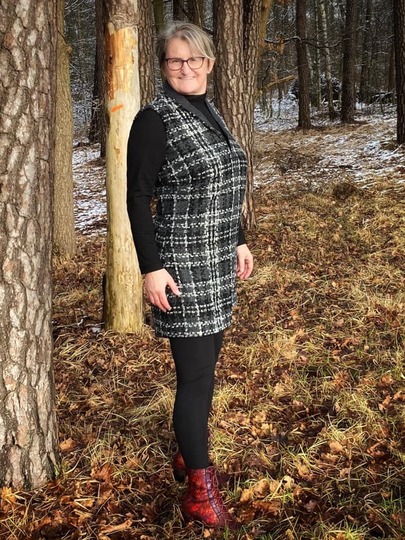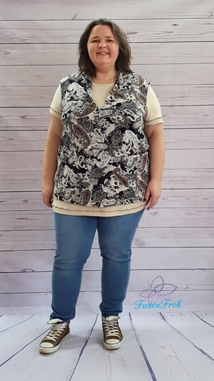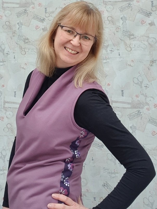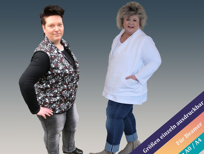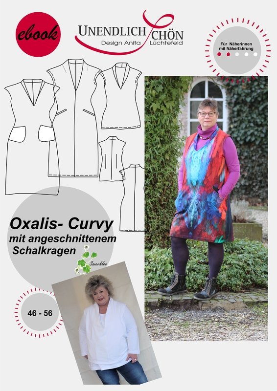 Oxalis Curvy, von 46 - 56 ein ärmelloses Oberteil, was im Sommer Solo oder über ein schmales Shirt getragen werden kann. Mit diesem Schnittmuster kann sowohl Pullunder, Weste, Tunika, als auch Kleider in div. Längen genäht werden.