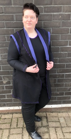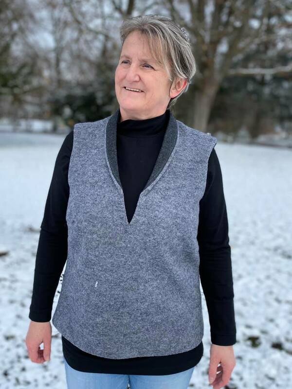 Der Schnitt bietet durch seine vielen Längen die Möglichkeiten als schmales Kleid in 2 Längen, als Tunika oder Pullunder. Wenn man die vordere Naht offen lässt, kann man mit diesem Schnittmuster auch ganz schnell eine Weste nähen (der Beleg hierfür ist im Schnitt eingezeichnet).