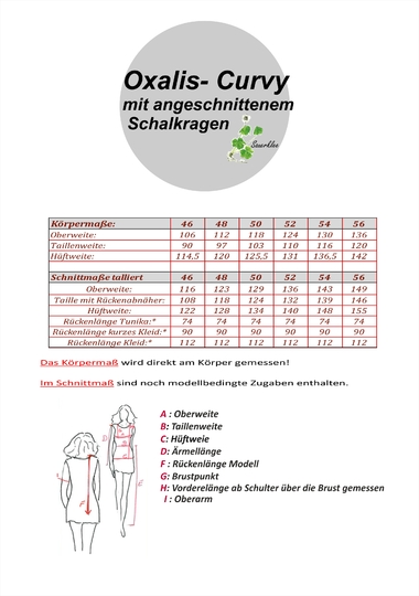 Dieses Schnittmuster ist mit Anleitung, Stoffverbrauch, Legeplan, sowie sämtlichen Naht- und Saumzugaben in den Größen von 46 - 56 erhältlich!