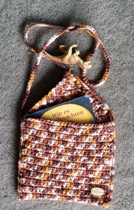 Die Tasche ist ca. 15x15 cm groß - passend für etwa 5 kleine Bilderbücher. Der Träger kann variabel angepasst werden.