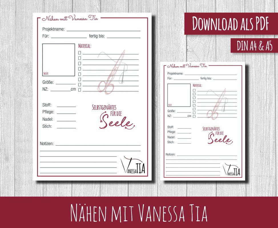 Wenn dir die erste Idee zu einem Projekt kommt oder du dir eins ausgesucht hast, kannst du diese Datei benutzen. Du kannst dir den Projektnamen, die Person die du benähst (vergiss nicht ab und zu auch mal etwas für dich zu nähen!) und das Zieldatum notieren. Außerdem hast du die möglichkeit das Projekt zu skizzieren. Auf der rechten Seite hast du genug Platz um die Materialien, die du benötigst zu notieren. Unten findest du Angaben wie, Stoff, Pflege, Nadel sowie Notizen für alle anderen wichtigen Informationen.