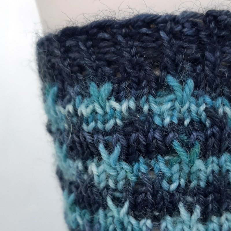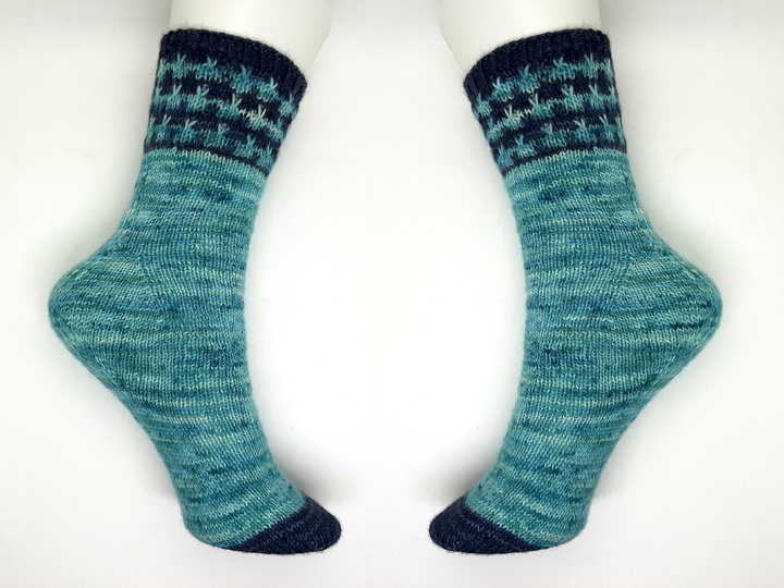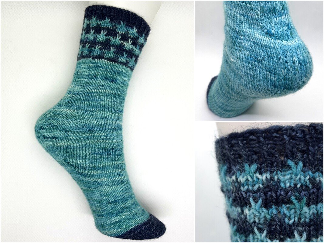 Maschenprobe: 4-fach Sockenwolle, Nadelspiel mit der Nadelstärke 2,5 mm, 10 x 10 cm = 47 Reihen und 32 Masche.