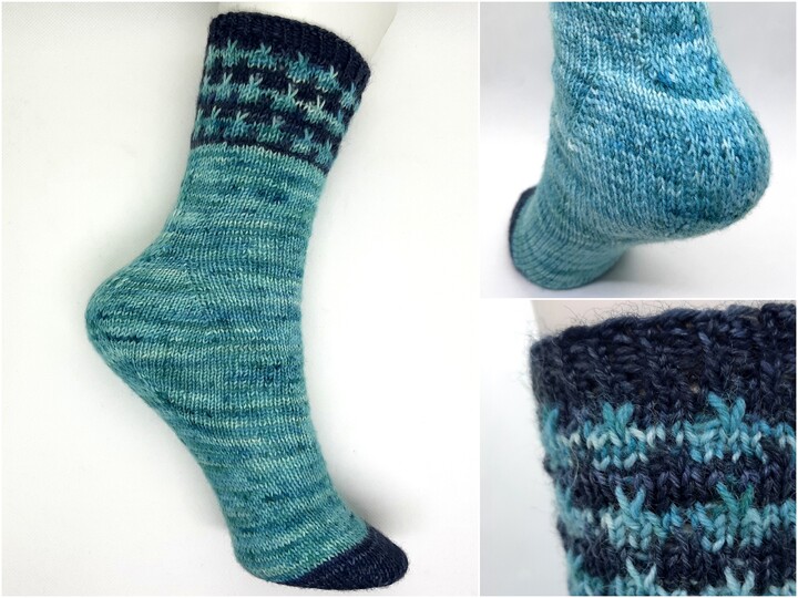 Die Ferse hat ein verstärktes Mittelstück. Das Schaftmuster KANN zweifarbig gestrickt werden. Hier stricken wir Hebemaschen (wird in einer Fotostrecke erklärt).