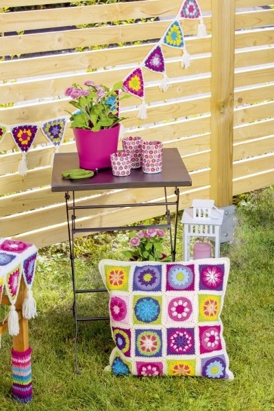 Häkelgarn „Bravo“ (100% Acryl, LL = ca 103 m/50 g) wie folgt je 50 g, A = rosé (Fb 8206), B = begonie (Fb 8341), C = power pink (Fb 8350), D = candy (Fb 8305), E = melba (Fb 8346), F = himbeere (Fb 8339), G = gelb (Fb 8210), H = limone (Fb 8194), I = flieder (Fb 8190), J = violett (Fb 8303), K = türkis (Fb 8324), L = smaragd (Fb 8321), M = iris (Fb 8259), N = glacier (Fb 8263), O = aster (Fb 8344), P = lachs (Fb 8342); für den Hocker 200 g, für das Kissen und die Girlande je 100 g, Q = ecru (Fb 8200) von Schachenmayr