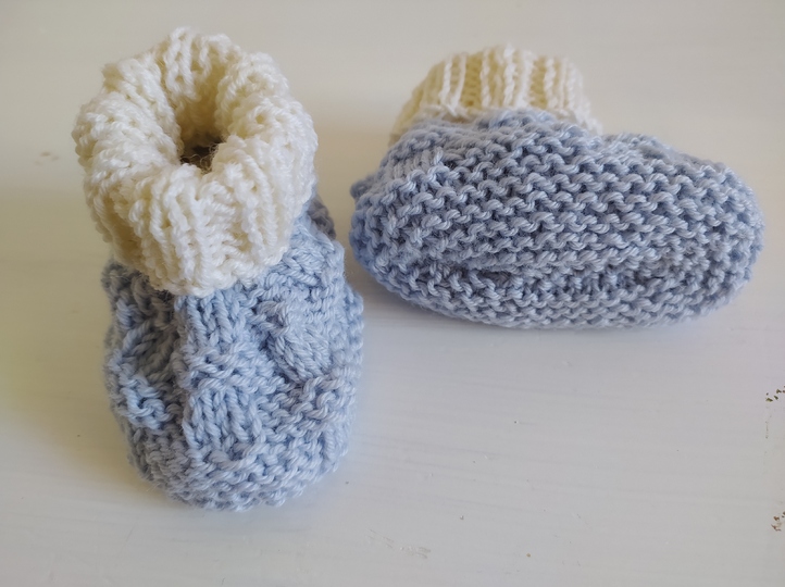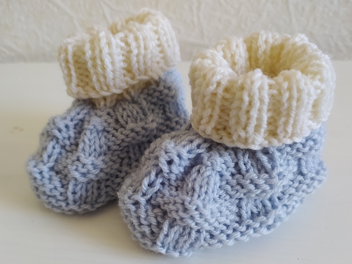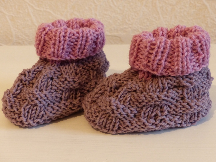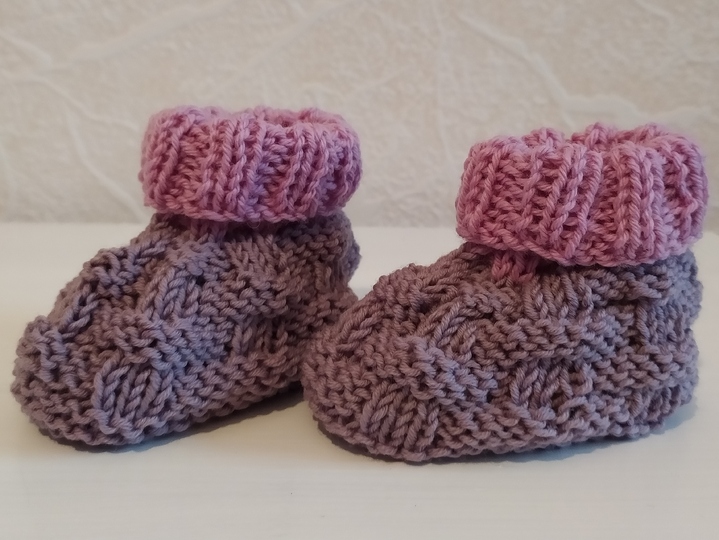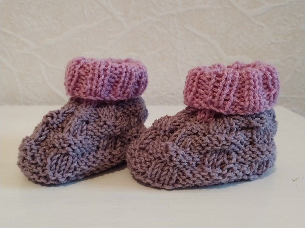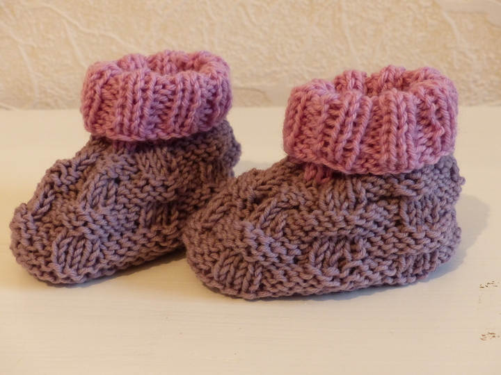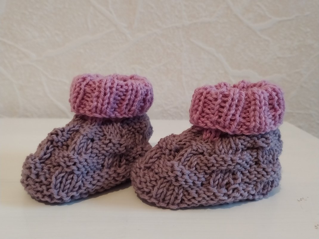 Strickanleitung für Babyschuhe mit einem Flechtmuster.