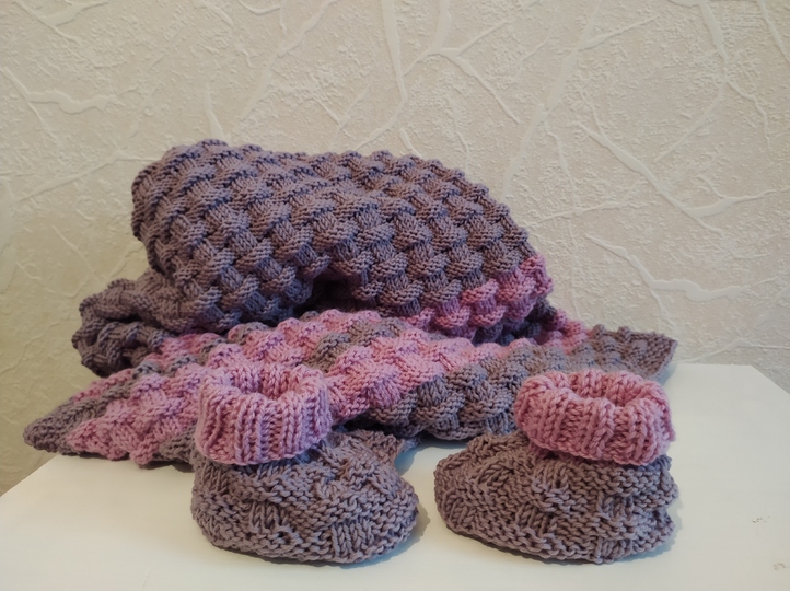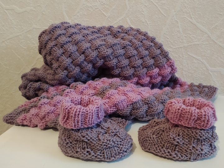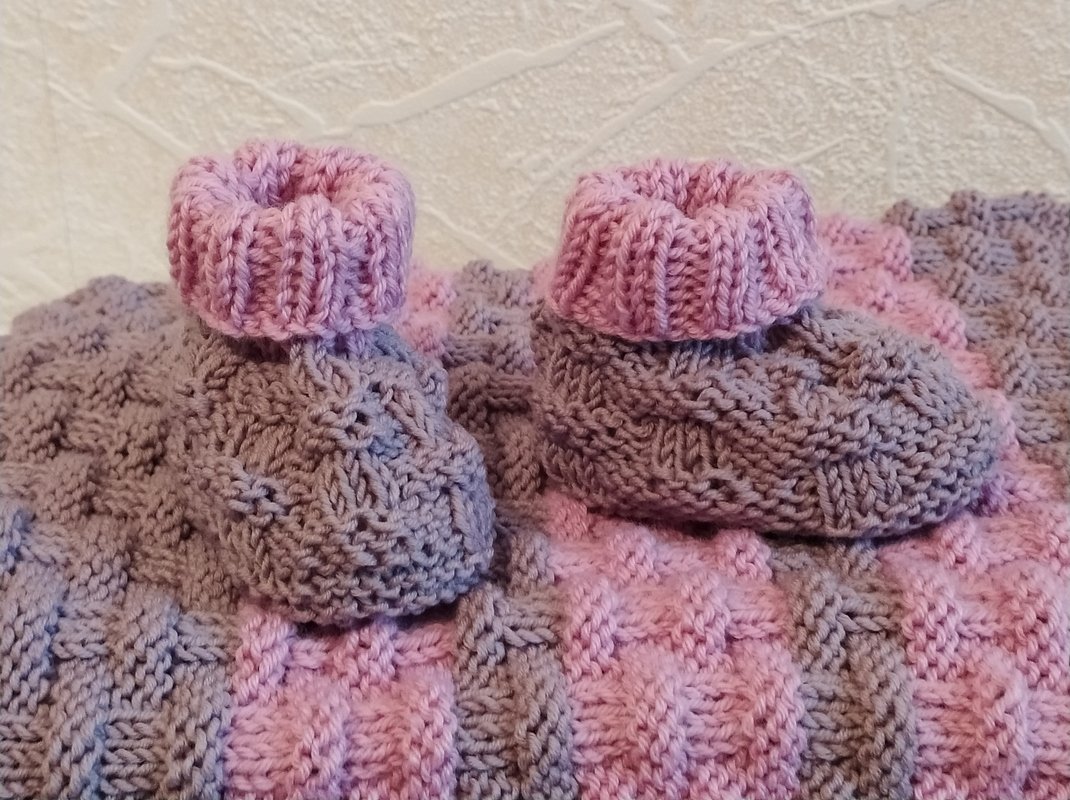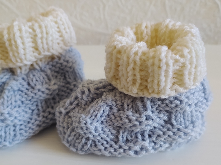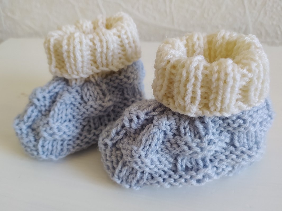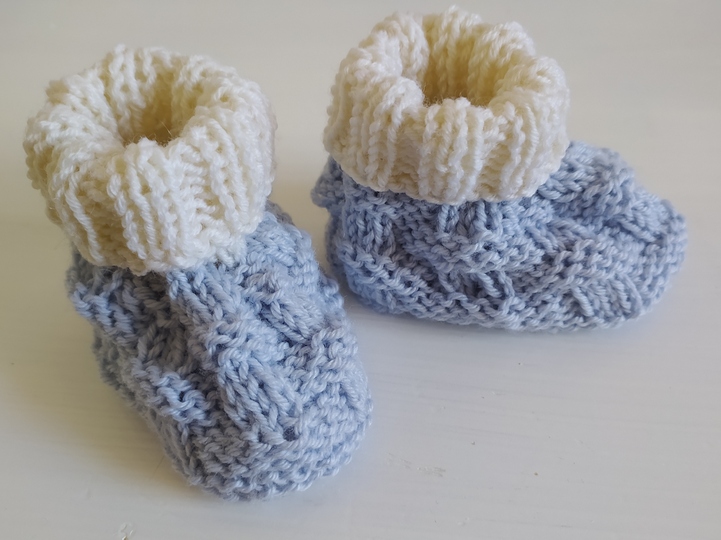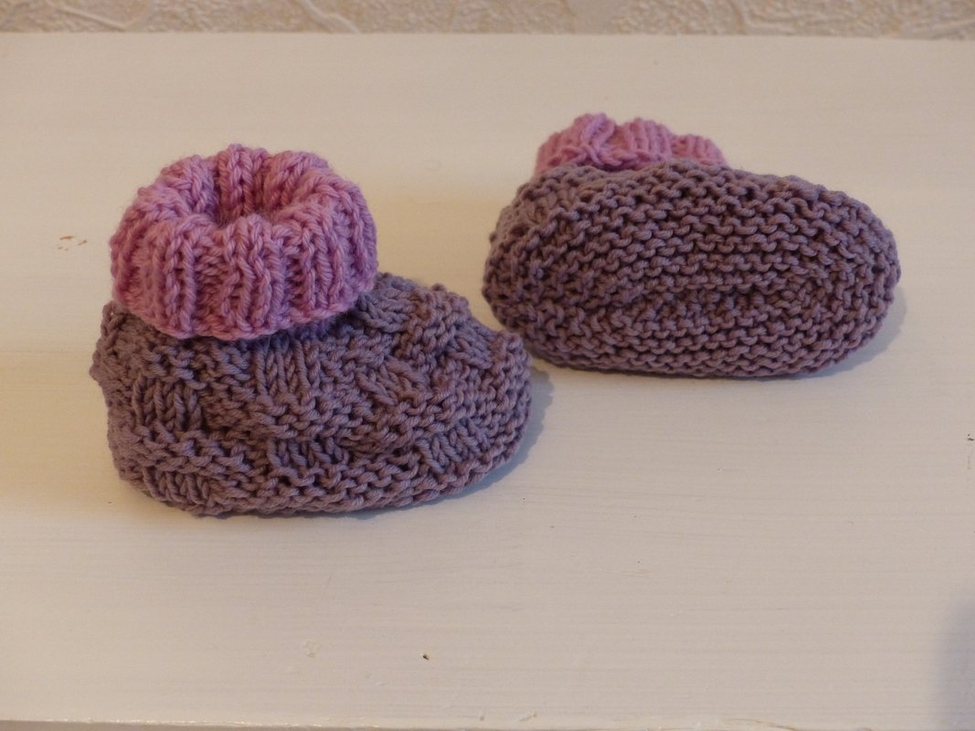 Strickanleitung für Babyschuhe mit einem Flechtmuster.