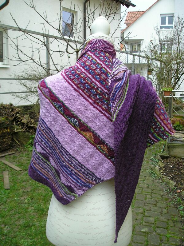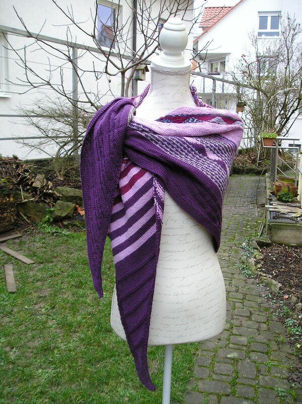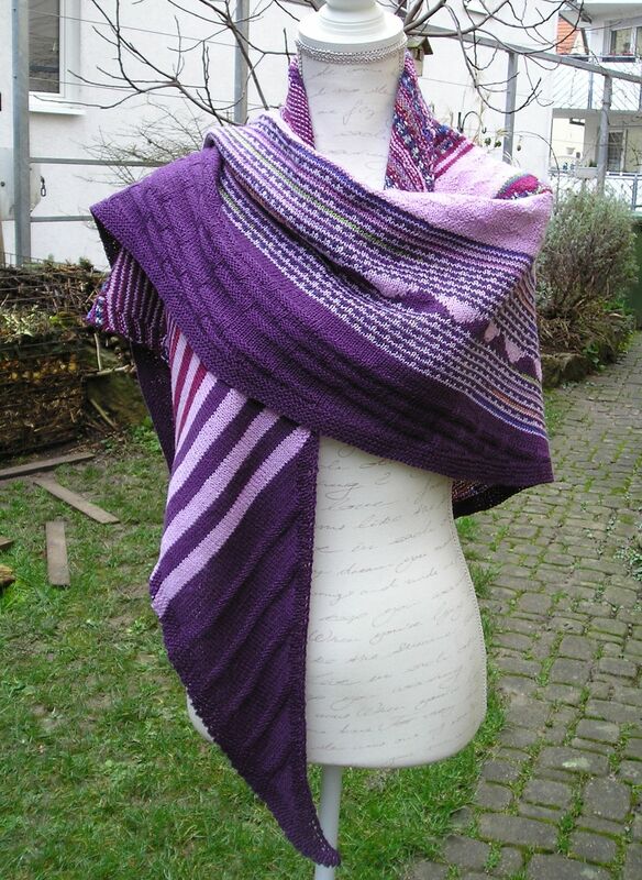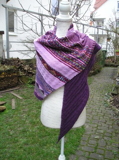Das Tuch wird aus 4-fädiger Sockenwolle zu einem asymmetrisches Tuch verstrickt. Dabei wirden violett, kardinalrot, flieder und ein buntes Farbverlaufsgarn verwendet. Das Muster setzt sich aus verschieden breiten einfarbigen Streifen und mehreren Streifen mit verkürzten Reihen und solchen mit Hebemachen zusammen. Die breiten einfarbigen Streifen werden mit Mustern aus rechten und linken Maschen versehen. Dabei entsteht ein abwechslungsreichen farbharmonisches Tuch, das wegen der verwendeten dünnen Stricknadeln relativ dicht und somit schön warm ist.