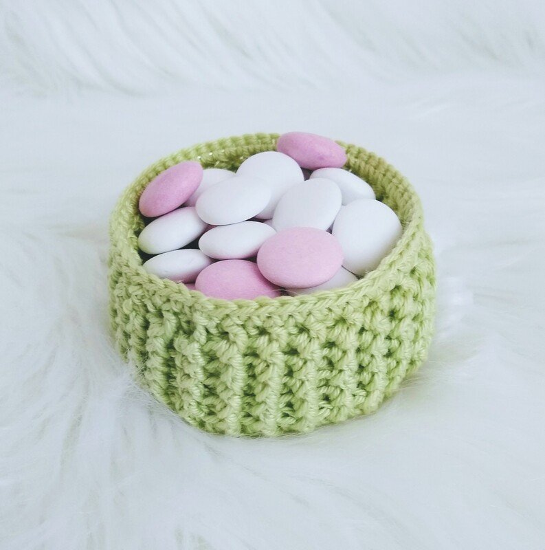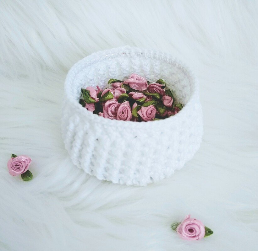 Häkelanleitung für ein kleines Utensilo-Körbchen, gehäkelt aus festen Maschen, Stäbchen und Reliefstäbchen.