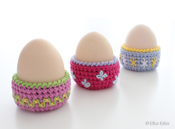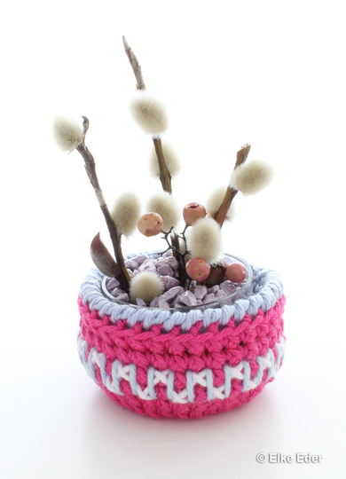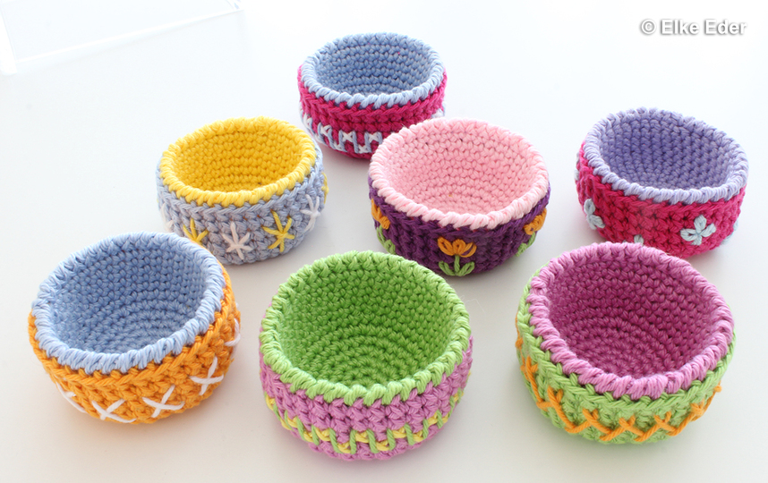 Die Körbe sind eine Kombination von festen Maschen (Innenkorb) und Doppelmaschen (Außenkorb) - dadurch sind sie wunderbar zum Besticken geeignet. Hier sind keine Grenzen gesetzt - du kannst sie wie gezeigt mit Kreuzstich oder Blümchen besticken, aber auch mit Zickzackstich, Hexenstich etc. Natürlich kannst du auch die Farben so variieren wie es dir gefällt.