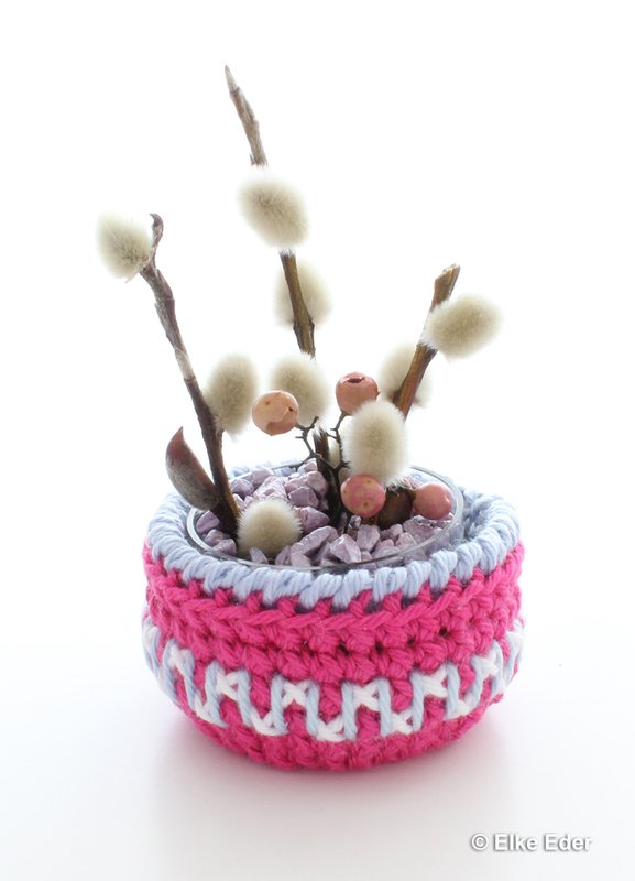 Die Körbchen werden mit festen Maschen, der Doppelmasche und Krebsmaschen gehäkelt. Hierfür bekommst du eine sehr ausführliche Anleitung mit Text und zahlreichen Schrittbildern.