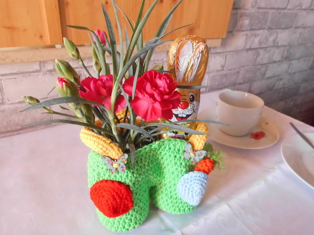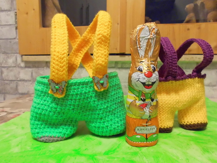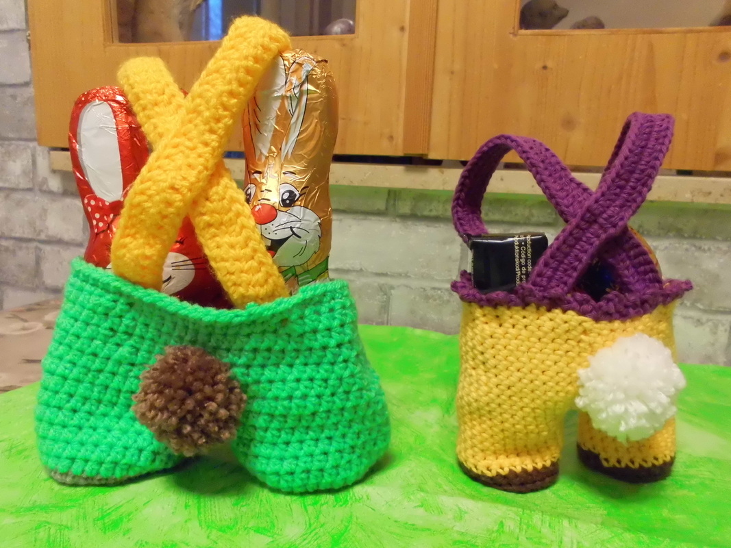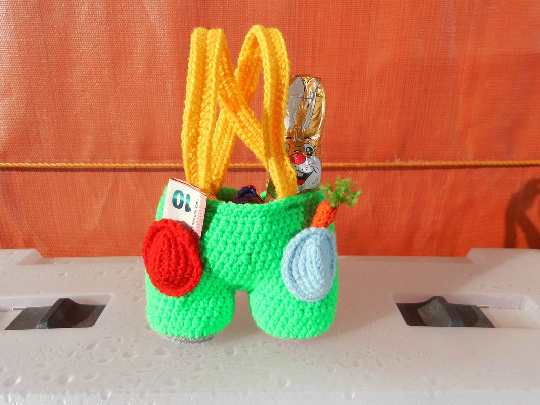 Wenn zu Ostern noch Schnee liegt, dann zieht der Hase seine Hose aus und packt dort die Leckereien hinein. Denn er selbst hat ein dickes Fell was ihn wärmt und braucht die Hose nicht. Diese Anleitung beschreibt die Häkel-Schritte für eine kleine und eine große Hose als Osternest. Die Anleitung zur Möhre ist auch dabei.