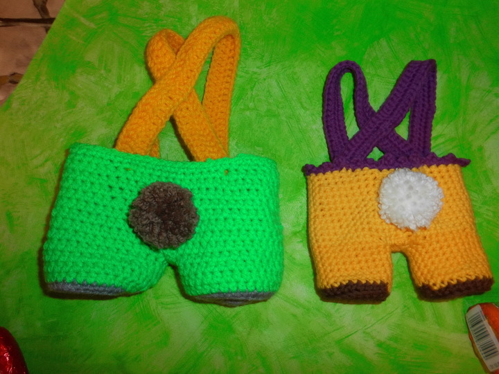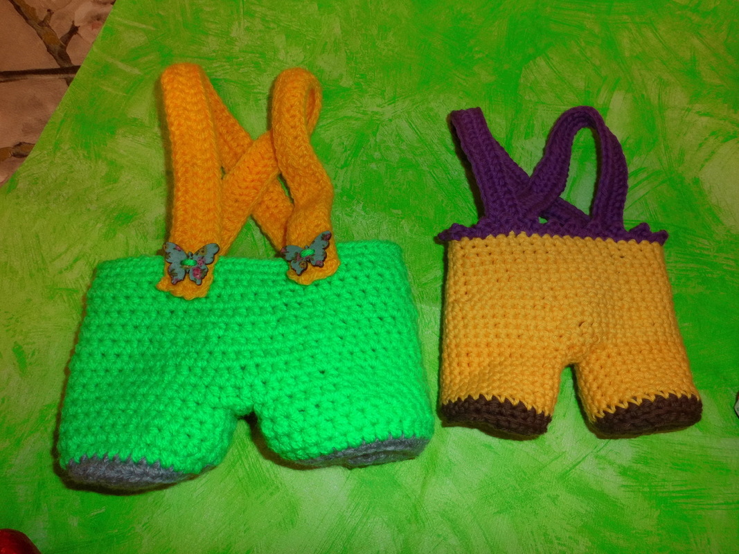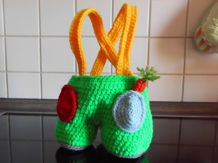 Die Anleitung ist 5 Seiten lang und mit 14 Bildern untermalt. Die große Hose wurde mit halben Stäbchen und die kleine Hose nur mit festen Maschen gehäkelt. Weiterhin solltest Du zu-und abnehmen können.