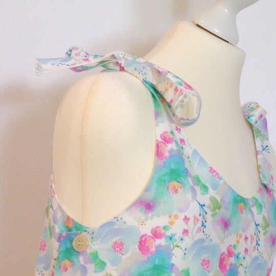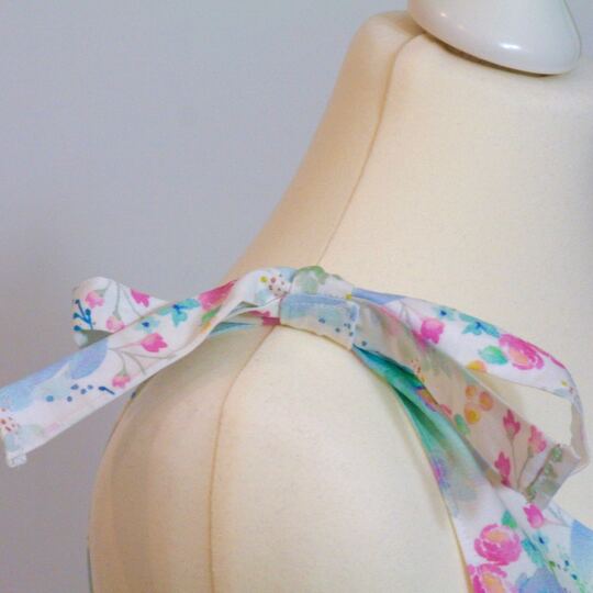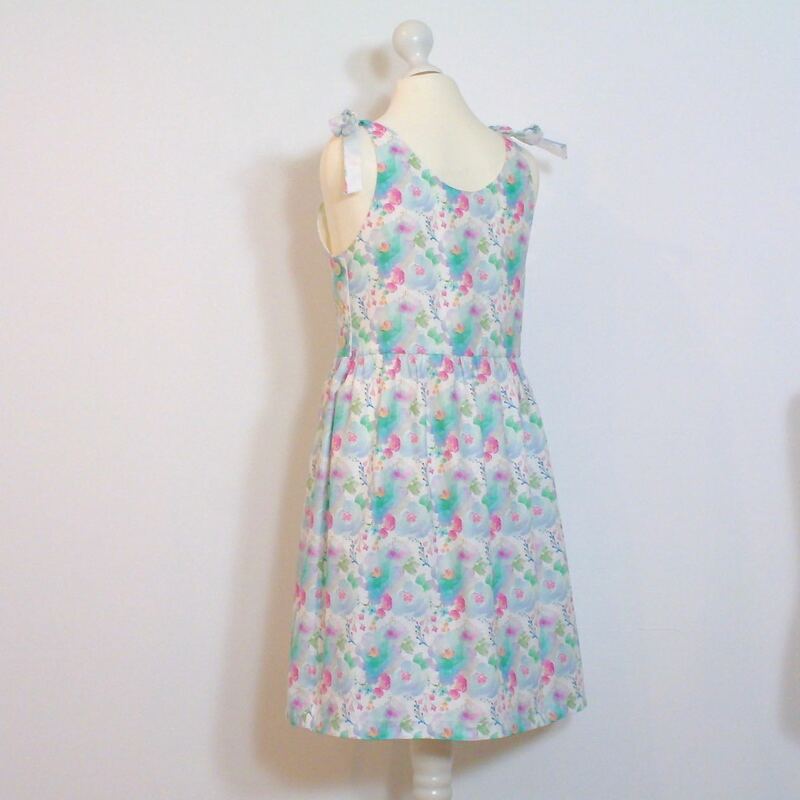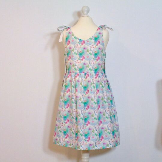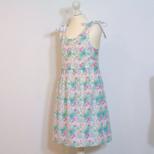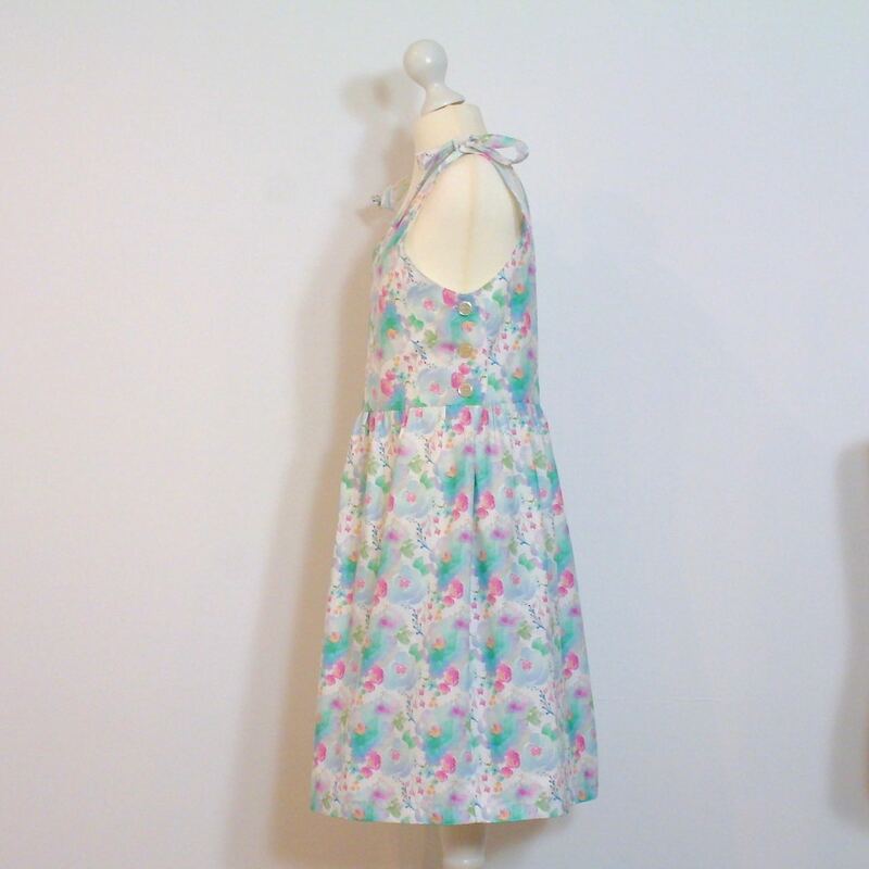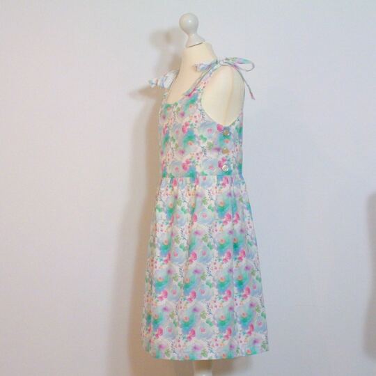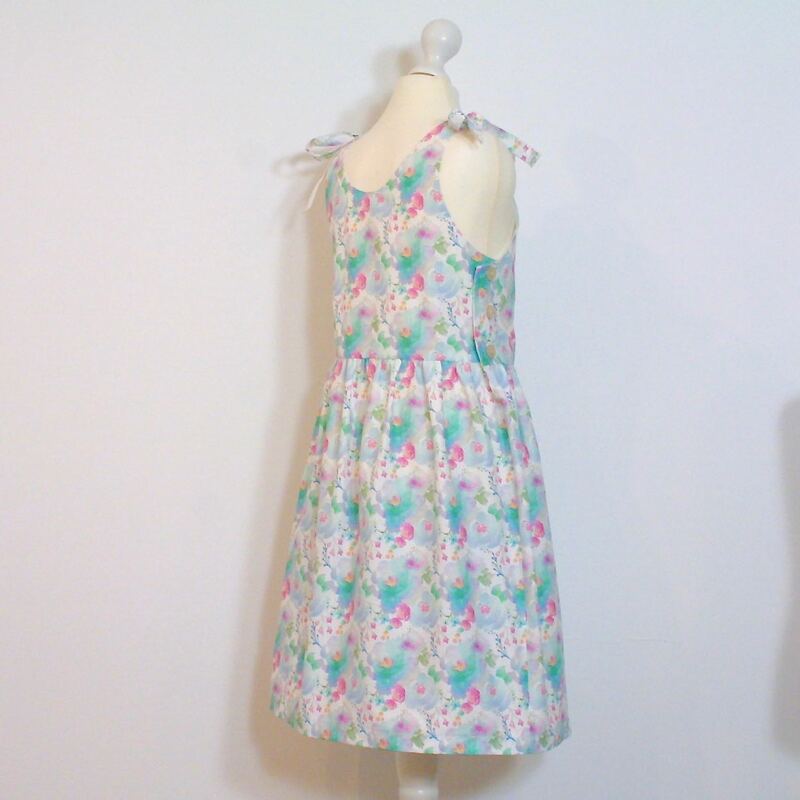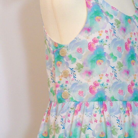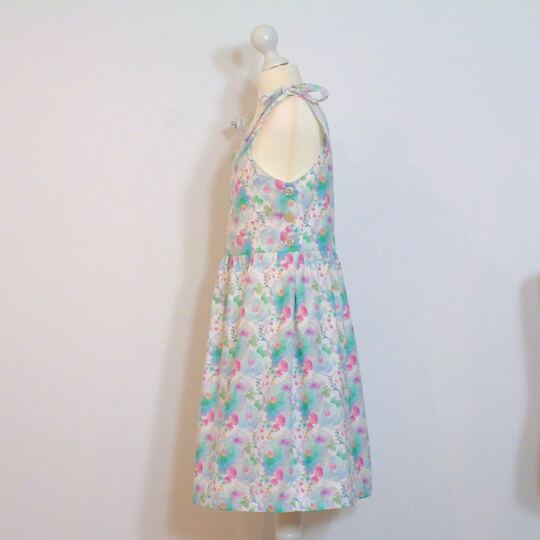 Mein Beitrag zur Nachhaltigkeit: Wenn man aus guten Stoffen näht, sollte ein Kinderkleid doch mehr als eine Saison halten. Deshalb habe ich ein Konzept entwickelt, mit dem sich das Kleid längen und weiten lässt. Drei Elemente sorgen dafür, das das möglich ist: Das Kleid wird oben an der Schulter gebunden, hier kann man also höher oder tiefer binden. Das Kleid wird, da aus gerade geschnittener Baumwolle genäht, unten mit doppeltem Saum versehen. Den kann man mit dem Wachstum heraus lassen. Zum Weiten dient die seitliche Knöpfung. Durch Versetzen der Knöpfe lässt sich das Kleid enger oder weiter stellen. Einige Zentimeter sind so drin.