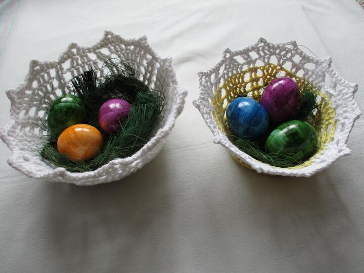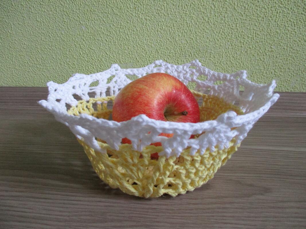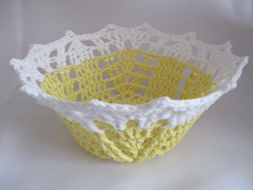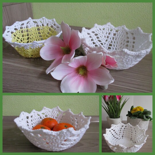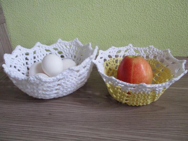Die Schale aus Baumwollgarn in gelb/weiß hat einen Durchmesser von 16cm oben und 9cm am Boden und 8cm hoch. Die Schale in weiß wurde aus etwas dickerem Garn gehäkelt, hat einen Durchmesser von 19cm oben und 10,5cm am Boden und 9cm hoch.