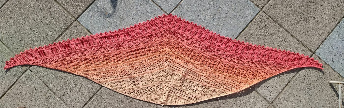 Unter Verwendung des angegebenen Materials wird das Tuch an der breitesten Stelle ca. 54 cm hoch und 170 cm breit.