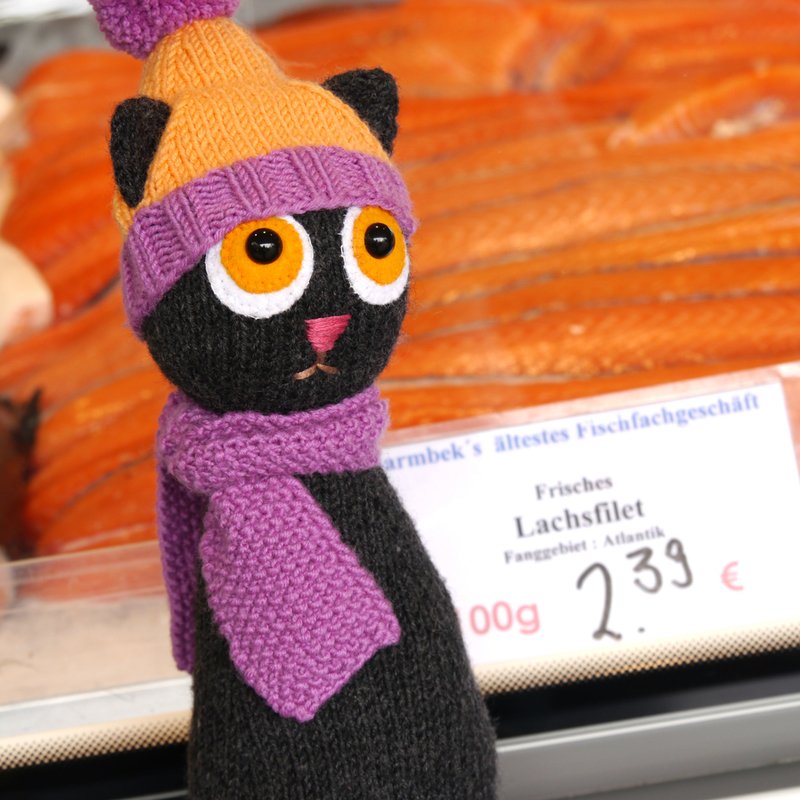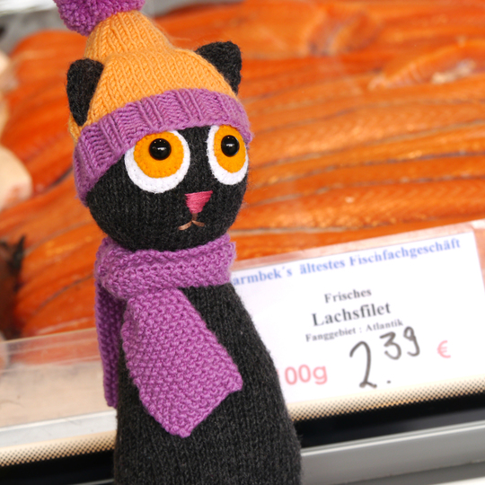 Schon als ich zum ersten Mal über meine Website nachdachte, war mir eins klar: Ich wollte ein Logo entwerfen, das man stricken kann. Und voil? , hier schnurrt das Logo-Kätzchen! Lange habe ich nach dem richtigen Namen gesucht, dabei lag er doch so nahe – Steffi soll die Katze heißen. Ich bin zwar ein ausgewachsenes Exemplar, doch bin ich genauso verfröstelt wie sie und trage den lieben langen Winter Mützen und Schals!