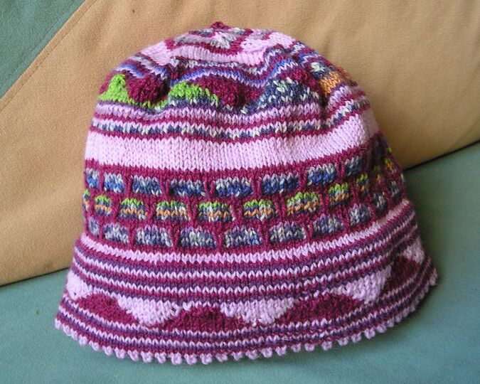 Die Mütze wird mit einem Mäusezähnchenrand gestrickt. Dafür wird am Mützenrand ein breiter Streifen gestrickt, dieser zusammengeklappt und die beiden Ränder zusammengestrickt. Man braucht dafür einen provsorischen Maschenanschlag und ein einfaches Lochmuster. Wie das geht, ist ausführlich erklärt. Die Streifen mit den Dreiecken werden mit verkürzten Reihen gestrickt. Außerdem gibt es noch ein einfaches Hebemaschenmuster..Diese Mütze ist nicht unbedingt anfängergeeignet. Mit etwas Strickerfahrung bekommen Sie das hin. Und wenn nicht, fragen Sie mich einfach. Ich helfe Ihnen dann gern weiter.